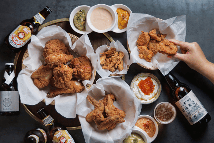 From the people behind CHIJMES yakiniku stalwart Renga-Ya comes Kindori, a casual restaurant where Japanese fried chicken is the whole she-bang. Fresh kampong chicken, chosen for its deeply flavourful meat is lovingly massaged with Japanese yoghurt and herbs, and deep-fried to a crisp golden. Whole, half, or a basket of wings: order it as you want it with dips like wasabi cream, metaiko mayo, and magic ikura cream. Starting from $6 for a small basket of Chicken Cartilage, you’ll want to take it all in with Japanese craft beers such as Far Yeast Blanc Yuzu ($16) and Echigo Koshikari Lager ($16).