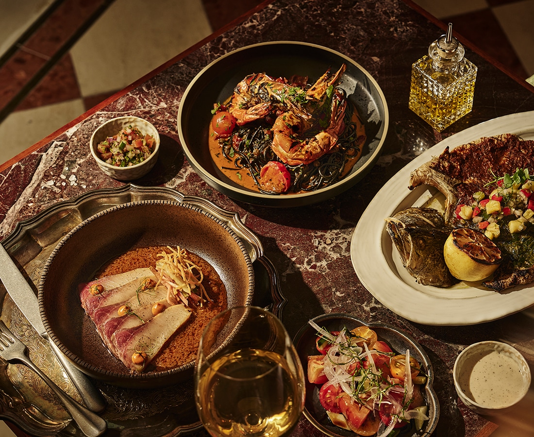 Modern Latin dishes at CUDO Singapore including tiger prawns with squid ink pasta, tuna tataki, and grilled fish—June 2025 new restaurant opening in Singapore