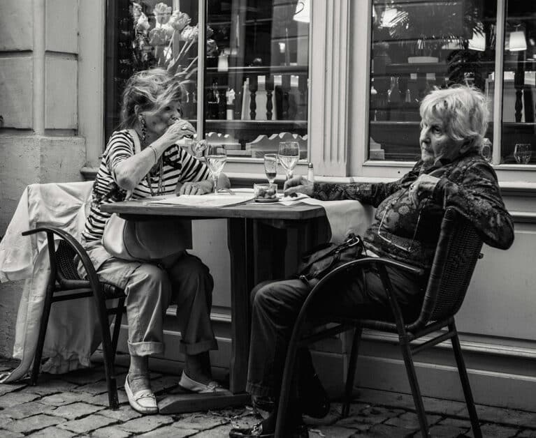Two elderly women dining al fresco at a European-style cafe with wine glasses and coffee cups on the table – black and white photo capturing candid moments of conversation and leisure.