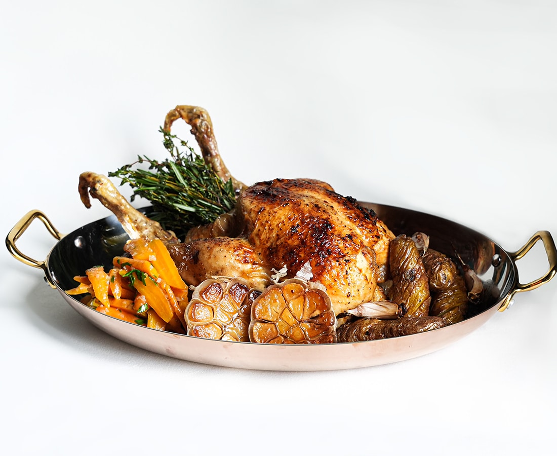 Slow-roasted rotisserie chicken with garlic, herbs, and roasted vegetables at The Plump Frenchman—new French restaurant in Bugis, Singapore, June 2025.