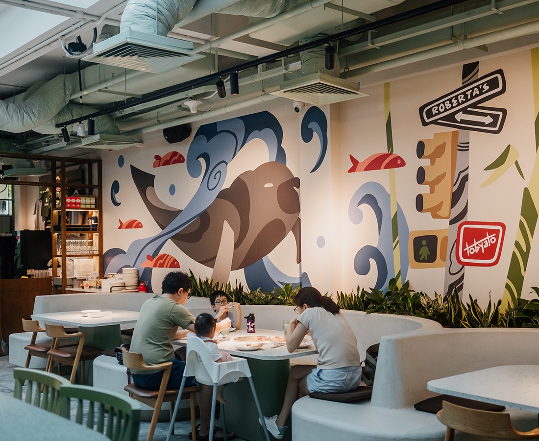 Family dining inside Roberta’s Mandai outlet with murals by Tobyato—New York pizza favourite opens new restaurant at Mandai Wildlife Reserve in Singapore.