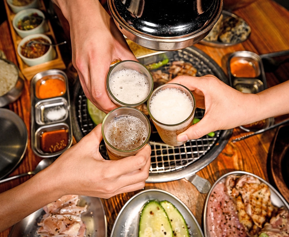 three hands toasting with beer to a korean barbecue in the background