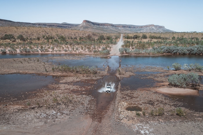 A former cattle trail, the Gibb river road’s first kilometres are the roughest stretch. We drive over the Pentecost River. I’m focused on driving, but I also look for saltwater crocodiles. It’s late August, which means it’s still dry season and road access is at its best. From November through March, it’s an impassable cauldron of tropical torrents and mud. Roads are submerged, and structures can be washed away.