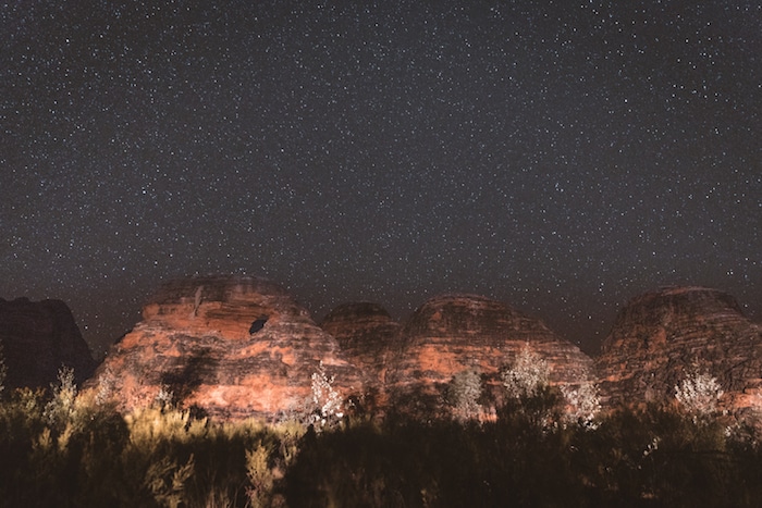 First, we traverse the Great Northern Highway – whose paving was finally completed in 1986 – for about 500km. We end up somewhere near the Mueller Ranges and set up camp on top of our car just after sunset. We sleep under the stars, over the moon, facing the Milky Way. The sky is so bright and feels so close that we have the impression we’re part of the solar system. It’s one of the darkest night skies in the world, yet there’s a sensational feeling of experiencing unadulterated pleasure on the edge of the world.