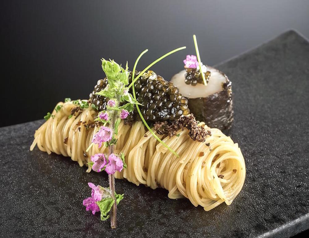 Top Image: Cold Angel Hair Pasta with Caviar and Black Truffle, Tropical Fruits in Sugar Sphere