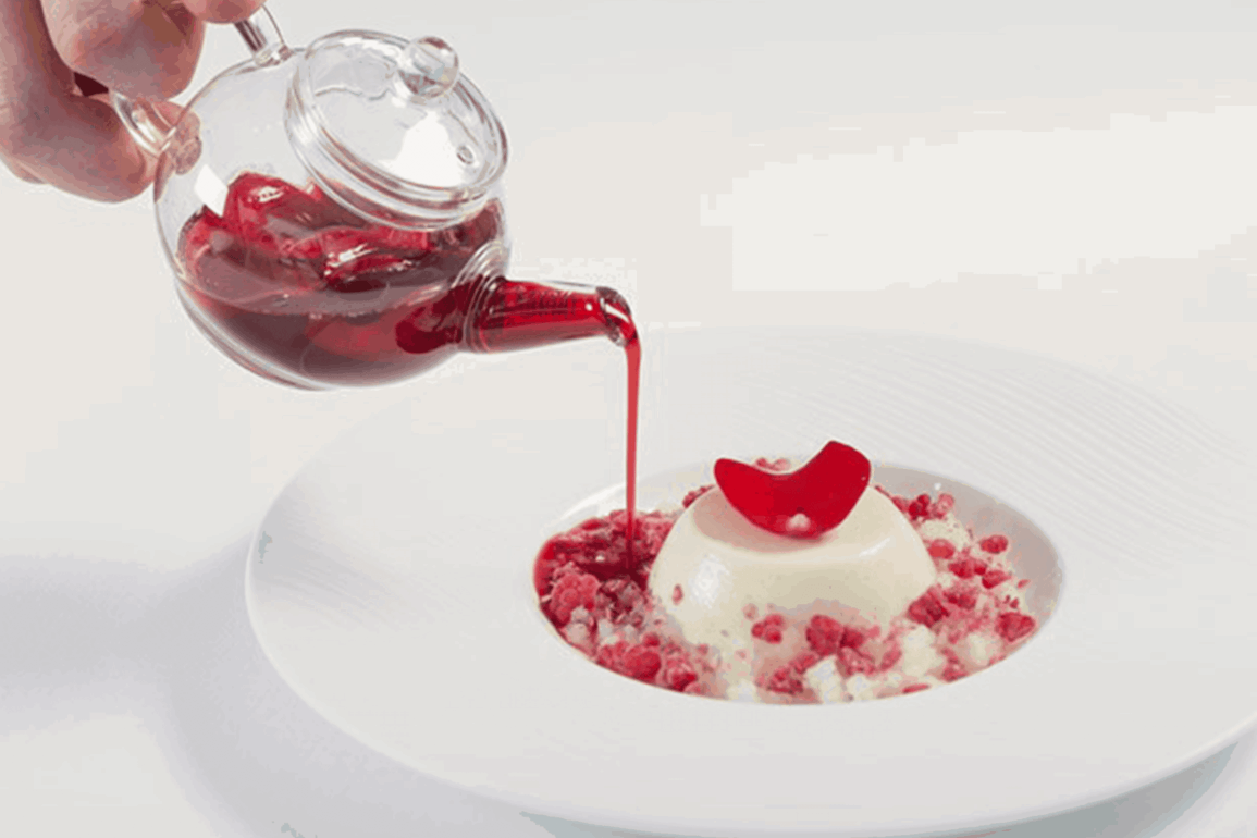 - To plate, loosen the panna cotta by gently running the moulds under warm water. Carefully tip it onto a plate, place a rose petal on top, and spoon some granita around the sides. Serve the tea on the side in a teapot filled with rose petals.