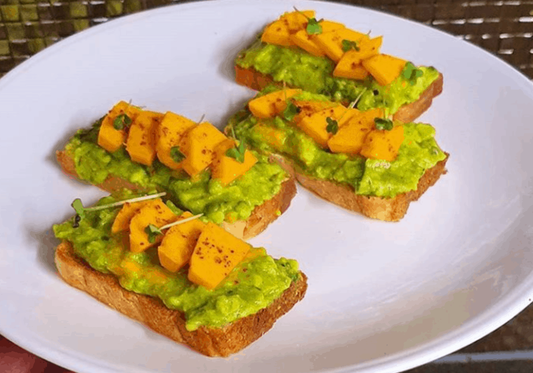 Step 9: Top the toast with the avocado mix and garnish with the sliced mango pieces, a pinch of salt, a pinch of chilli powder/paprika, and the remaining half of olive oil.
