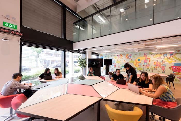 Located in the city centre within the former home of Singapore’s renowned Malaya Publishing House built in the 1900s, lyf@SMU features fun colours and quirky design elements cleverly situated within the conservation building. With more than 32,000 square feet of space, students can look forward to lounges fitted into co-working spaces with modular furniture, large communal tables at the social kitchen with interactive voting boards, at least 3 multimedia rooms to encourage collaboration and free flow of ideas, day beds, bean bags, and even resting pods!1c