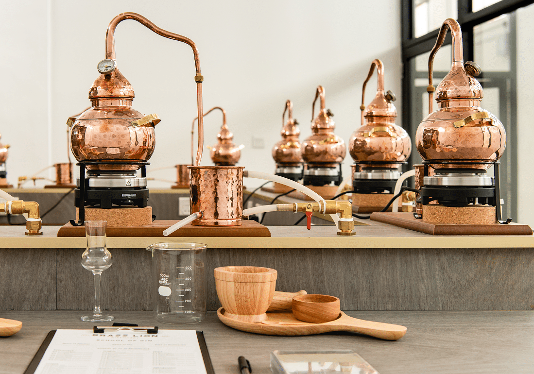 Class takes place on the distillery’s second floor. Seating an intimate ten students at a time, you’re first reminded that this school isn’t for kids – with a welcome G&T and a flight of three signature pours. At each seat, you get your very own miniature copper pot still – dwarfs compared to the original 150-litre mammoth sitting in the R&D lab below, but enough to churn out a good bottle (about 500ml) of gin.