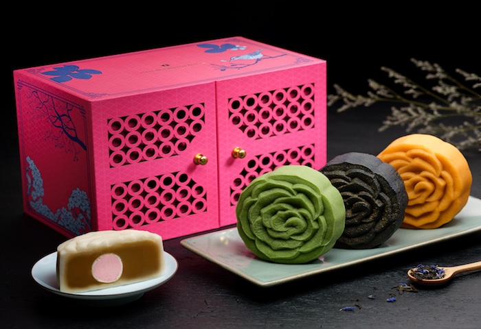 Goodwood Park Hotel brings in a gorgeously-hued masterpieces that are almost too beautiful to eat. Bite into the Blue Pea Flower with White Lotus Seed Paste and Melon Seeds ($64 for four pieces) to reveal flavours of white lotus paste mixed combined with blue pea flower essence, and melon seeds. An apt creation in line with National Day, the Almond Beancurd with Longan ($56 for four pieces) is champions one of our favourite local dessert with almond beancurd paste and ripe longan. For those who prefer something citrusy, there’s also the Soursop with Calamansi ($54 for four pieces).