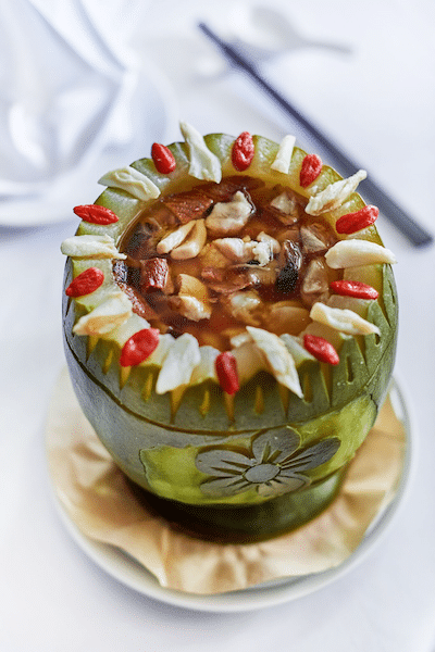 Of course, any respectable Chinese menu must have soup – in this case, the Double-Boiled Whole Winter Melon with Eight Treasures ($80, one-day advance order required) came contained in an individually carved winter melon bowl. Each spoonful of the soup was packed with flavours from the eight treasures of duck, chicken, prawns, crabmeat, Chinese mushrooms, conpoy, Chinese ham, and wolf berries. A sight to behold, this dish certainly doubles as a centrepiece when served.