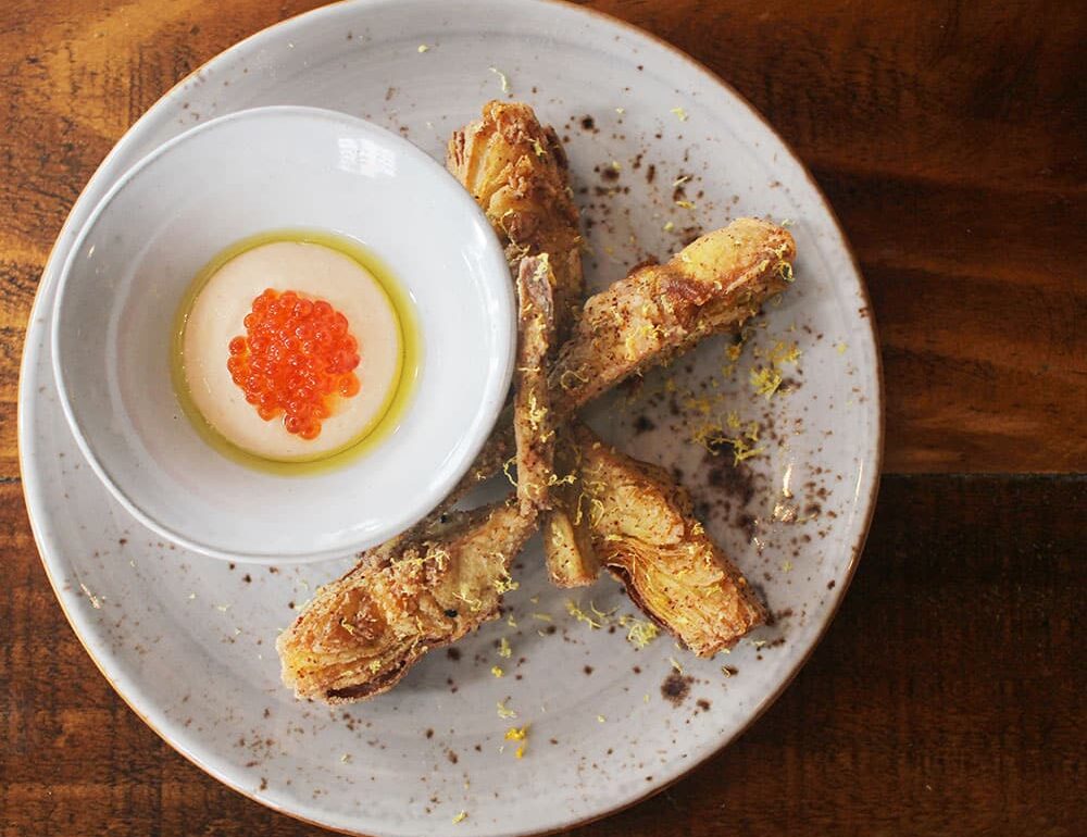 Top image: Fried artichokes, taramasalata, salmon roe, lemon