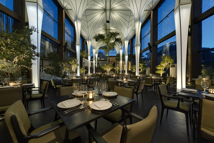 Set within the grounds of the Hanging Gardens of Bali, The Restaurant’s prime location affords an excellent vantage point for unobstructed vistas of the surrounding valleys, temple and gorges (the compound is terraced into the hillside). Gourmet meals dished out from the kitchen are inspired by French and Asian cuisines; service is attentive yet discreet. Some of the unique experiences including dining at the Secret Dalem Segara Temple or the above one of the world’s best swimming pools, beautifully illuminated by candles.