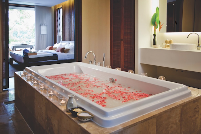 Both the bedroom and the living room open up to the patio on one side, with the huge master bathroom bookending the bedroom on the other. The living room is adjacent to the pantry fully equipped with a proper fridge, tea & coffee making facilities, tableware, wineglasses, and more. Everything is big here, even the bathtub with jaccuzzi jets, though the latter was too noisy to be relaxing when we switched them on. On the up side, when we phoned to request for bath salts, two members of the housekeeping staff showed up with a large basket which turned out to be prep materials for a rose petal bath. A nice surprise, for sure, and the experience so far ticks all the right boxes for a romantic escapade.
