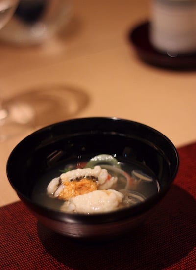 Nami Eel and Uni - Shangri-La Hotel SingaporeWe haven’t seen anything like the second dish in Singapore before – sea urchin wrapped in pike conger eel in a clear, smoky, umami broth. We’re too used to the creamy texture of raw sea urchin, so the firm texture of cooked uni didn’t appeal to us. The eel, though, was done perfectly; just watch out for the micro bones. With this dish, we also learnt that Chef Akiba makes his dashi with three types of dried bonito, which contributes towards the delicious smokiness of the broth.