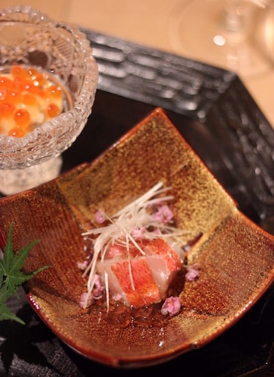 Made with kombu (Japanese kelp) from Hokkaido and katsuobushi (dried, fermented and smoked skipjack tuna, also known as bonito flakes) from Kyushu, the broth made its first appearance shortly in the form of dashi jelly with red snapper sashimi, served alongside a small dish of asari clam cooked in soy and topped with ikura. These tasty morsels were the first pair of appetisers of our Omakase ($190) dinner, which is probably the most complete experience of NAMI aside from the Sushi Omakase ($220), though there are a la carte options on the lunch and dinner menus too.