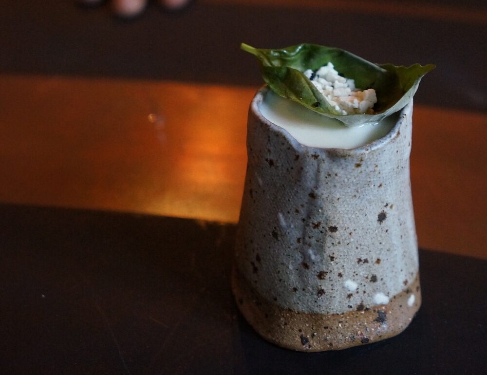 Featuring a basil leaf frozen with liquid nitrogen to hold basil meringue and crunchy ants as garnish, ANTZ ($23) is probably the most attention-grabbing drink on the menu. The ant hill-like ceramic vessel contains a shaken combination of salt-baked tapioca, homemade coconut yogurt, aged sugarcane juice, and agricole-style Chalong Bay rum.