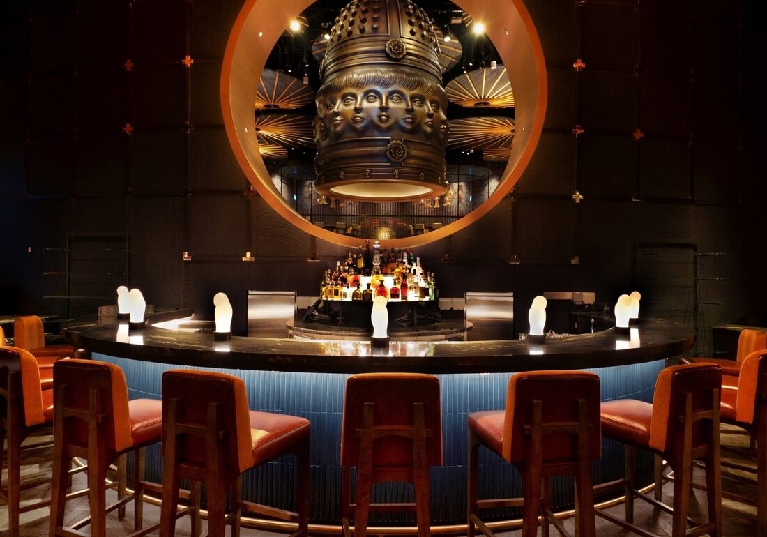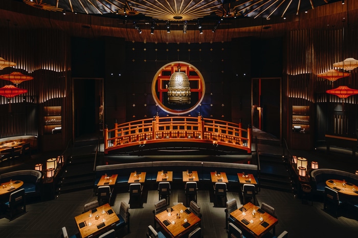 Inside, more picturesque Japanese elements await. A traditional Japanese foot bridge arches across the lounge, and a 2.5m-tall bell, embossed with twenty gleaming faces, takes pride of place over the bar, giving the space a mystical charm. To complete your ascent into zen, ceilings designed to resemble a tranquil pond surface soar dramatically overhead.