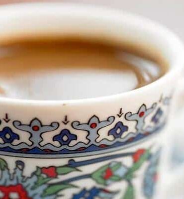 Confident older woman in black dress relaxing outdoors with a coffee, embodying grace, self-assurance, and healthy aging during menopause.