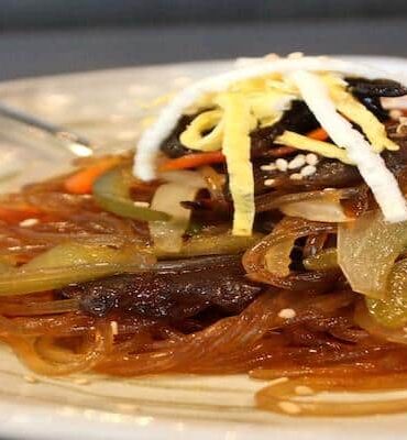 Korean bibimbap with egg yolk and assorted banchan on a dining table in Singapore