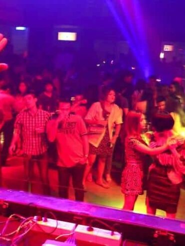 Crowd dancing under neon pink and blue lights inside an underground electronic music club in Moscow, Russia.