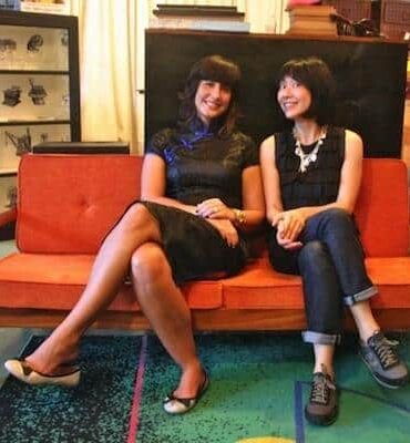 An Asian artisan couple wearing denim and military outfits sit side by side in a design studio, surrounded by colorful artwork and handcrafted goods