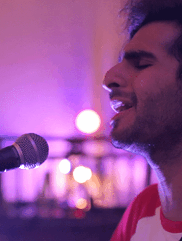 Wedding live band performing on stage with singer and musicians in formal attire, entertaining guests at a reception with illuminated ‘LOVE’ letters.