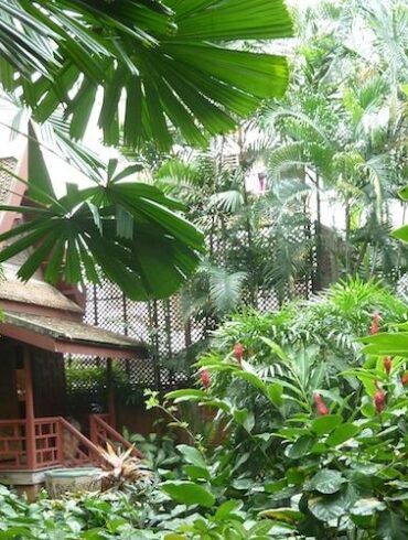 Night view of Gaa Bangkok’s courtyard with traditional wooden architecture and lush greenery.