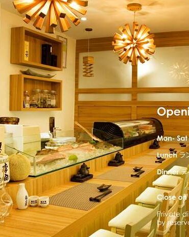 Japanese sushi chefs in traditional white uniforms preparing fresh fish at a sushi counter with wooden trays of tuna, salmon, and seafood for new restaurants in Singapore