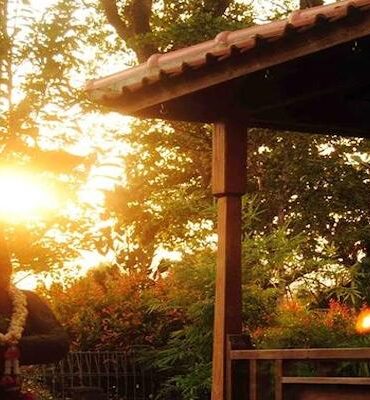 Night view of Gaa Bangkok’s courtyard with traditional wooden architecture and lush greenery.