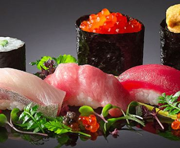 Japanese sushi chefs in traditional white uniforms preparing fresh fish at a sushi counter with wooden trays of tuna, salmon, and seafood for new restaurants in Singapore