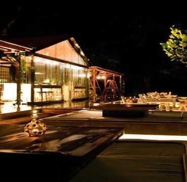 Night view of Gaa Bangkok’s courtyard with traditional wooden architecture and lush greenery.