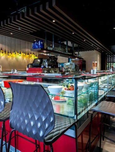 Japanese sushi chefs in traditional white uniforms preparing fresh fish at a sushi counter with wooden trays of tuna, salmon, and seafood for new restaurants in Singapore