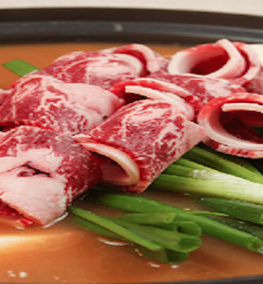 Thin slices of marbled beef grilling with vegetables at a Korean BBQ table, accompanied by white bowls of dipping sauces and banchan.