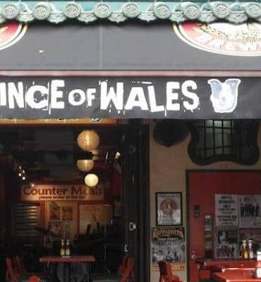 Lively outdoor dining scene at Sarnies café on Telok Ayer Street, Singapore, with diners seated at wooden tables against a backdrop of heritage shophouses.