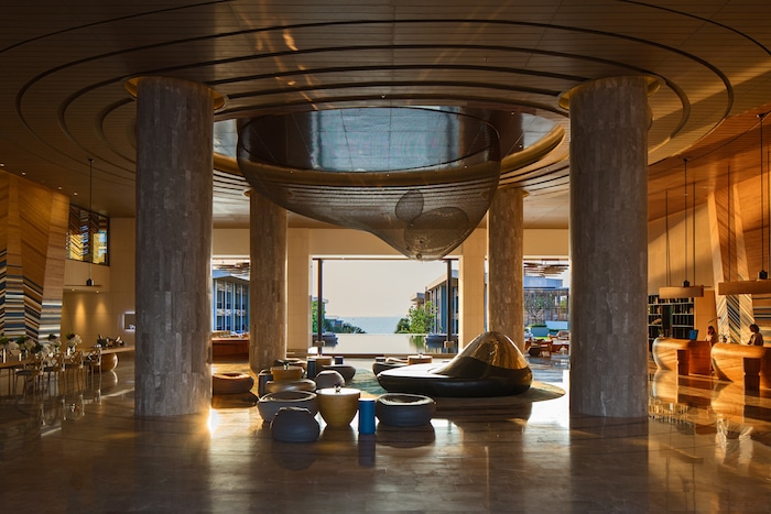 While enjoying the iced lemongrass juice that was served earlier as a welcome drink, I took a moment to admire the giant art installation in the centre of the high-ceilinged, open plan lobby. Resembling water drops in a crystal bubble, it complements the resort’s sophisticated architecture and contemporary décor that are mainly inspired by the art and culture of local fishing villages. Natural elements like water, rocks, seashells, woods, bamboo weaves, as well as Thai silk are combined, to emphasise the down-to-earth yet luxurious nature of this retreat.