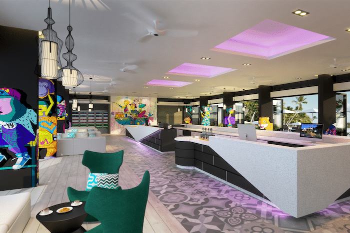 The first thing you’ll notice is Cassia Bintan is big on colour. From the bright neon polo shirts the staff don to the colourful apartments, the vibrant colour palette lends itself to the overall theme of excitement and youthful energy. The hotel lobby, known as  ‘The Meeting Place’, is reminiscent of a modern-day bachelor pad. The open concept with Market 23, cafe, and games room (think darts and foosball table) is tied together by the quirky and colourful street art inspired murals of Indonesian artist Adi Dharma from Jakarta. They’re dotted around the rest of the property, adding a whimsical touch to the place.