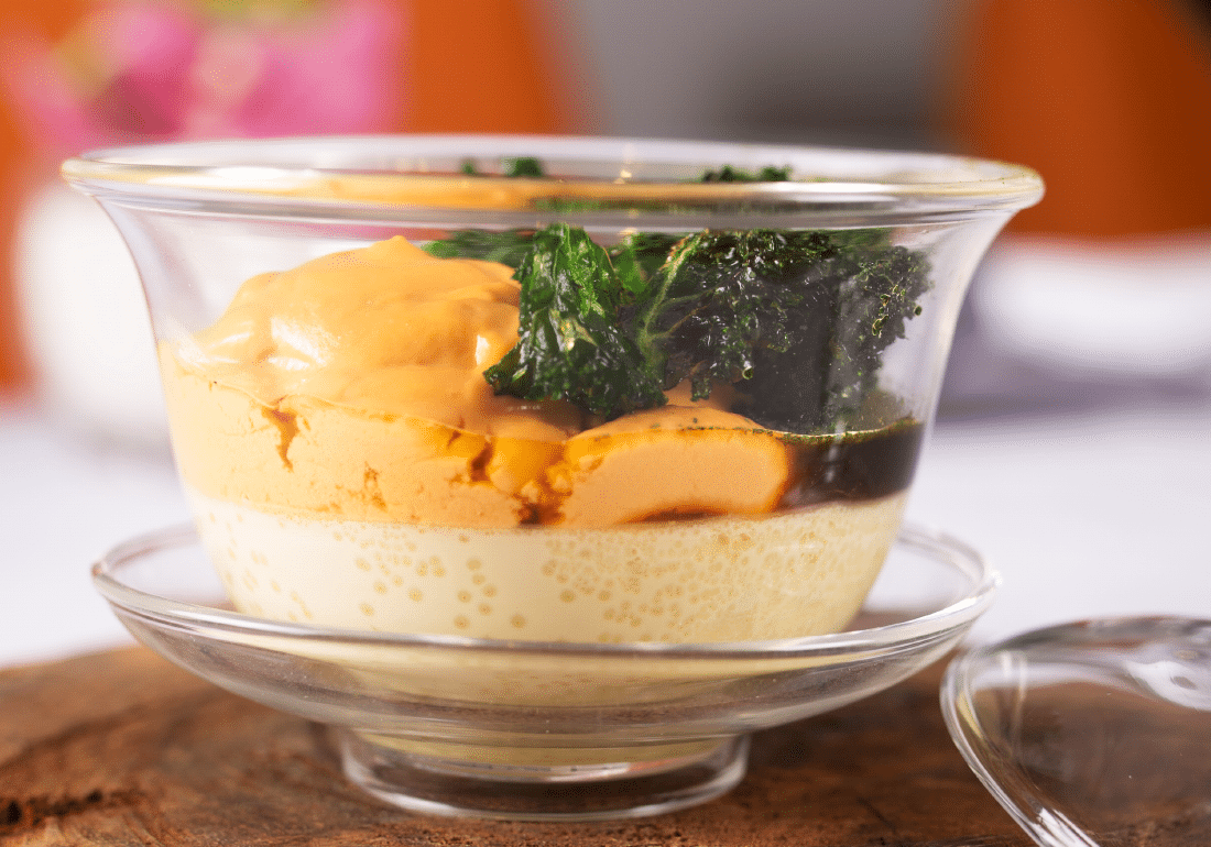To the course dishes: the Okayama Muscat Grape is a delightful interplay of sweet and savoury — julienned Okayama grapes and Hokkaido uni perched on top of fatty chutoro tartare that he mixes with pine nuts and peppery nasturtium flowers. A spicy-salty yuzu koshō sorbet kicks up the flavour a notch. There is an umami-rich egg creation, the Muirgen Oyster, that comes with bits of sweet botan ebi and Irish oysters. It’s a chawanmushi of sorts, though a two-layered one with creamy choron sauce (a tomatoey Béarnaise), truffle jus, and a bit of uni and crispy kale on top.