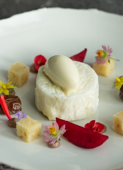 Alexander McKinstry, who heads the pastry kitchen, makes a mind-blowing cheese dessert that’s like nothing I’ve tasted. A wheel of trompe l’oeil Goat’s Cheese is made with milk skin to resemble the outer casing, and the interior has a consistency like burrata. He plates this with cheese sponge cake, brown butter ice cream, as well as rosella-infused pickled apples. The combination is otherworldly.