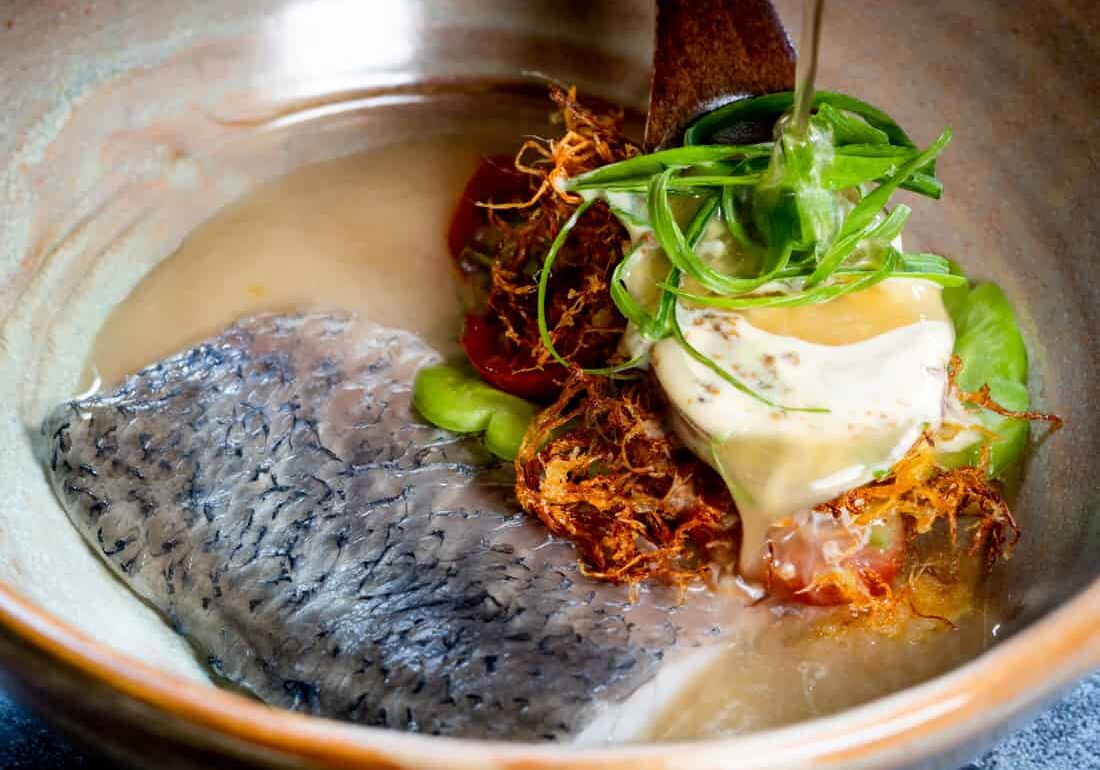 Locally sourced produce is a key part of the Avenue 87 ethos, with microgreens from Farm Delight and seafood from Ah Hua Kelong finding their way onto our plates. The AHK Seabass, for one, turns poached seabass from Ah Hua Kelong into a rich rendition of our familiar sliced fish soup. With a fish stock enhanced with anchovy oil and a silky spoonful of anchovy butter milk sauce, the soup is lightly peppery and deeply umami.