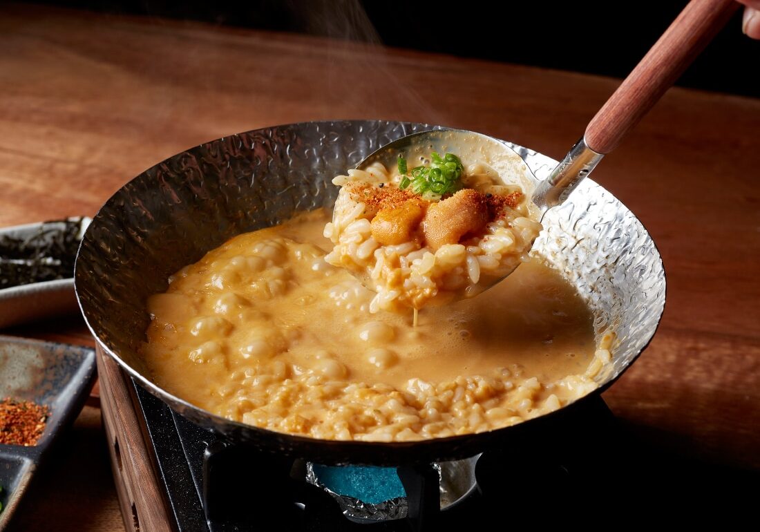 If you want to indulge, order the Uni Shabu Shabu (S$68), because it’s the most extravagant thing here. Chef Asai makes a cloudy orange broth with fresh urchin, and the aroma alone intoxicates our senses in seconds. He tells us the dish first originated in Osaka where guests would enjoy fresh seafood shabu shabu-style, and here, we get oyster, crab, prawn, and abalone served in a personal hot pot. At the end, the server cooks down the remaining broth with Yumepirika rice, kizami nori, and sevens-spiced powder to create an umami-rich porridge. How many ways are there to say “dreamy”?
