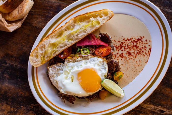 Even the mainstays remain fresh and creative. The Hummus & Iraqi Spiced Mushrooms (S$14) get a boost with an evolved hummus (blended with blanched chickpeas, and cumin) and locally-farmed mushrooms (from Kin Yan Agrotech) that’ve been seasoned in a leavened thyme spice mix, then garnished with toasted black sesame, smoked paprika, and a vinegary tahini. It’s vegan too.