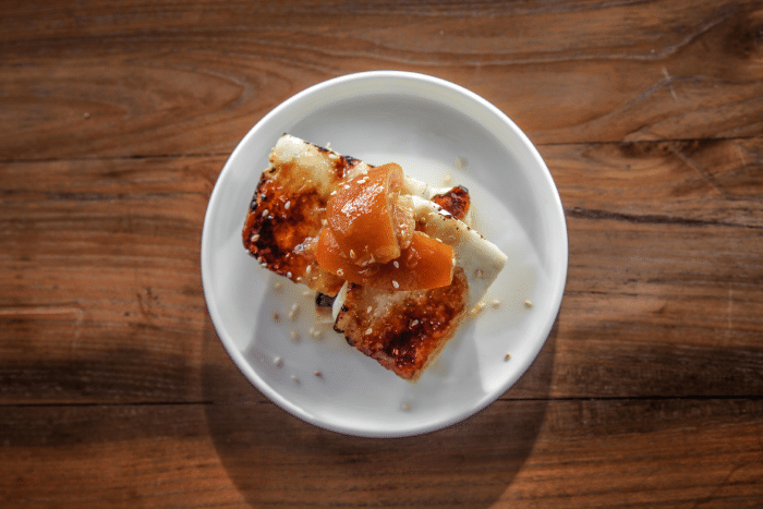 Cheese Saganaki ($15): Oven-baked halloumi with a fruity twist