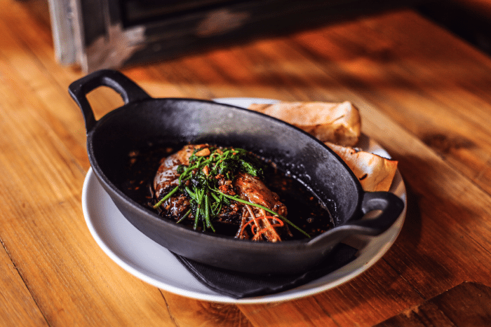 The Garlic Prawn sits in its own sizzling juices with olive oil and garlic.