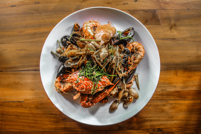 Shellfish Stir-Fry is a striking bowl of flower crabs, seasonal prawns, mussels, and clams.