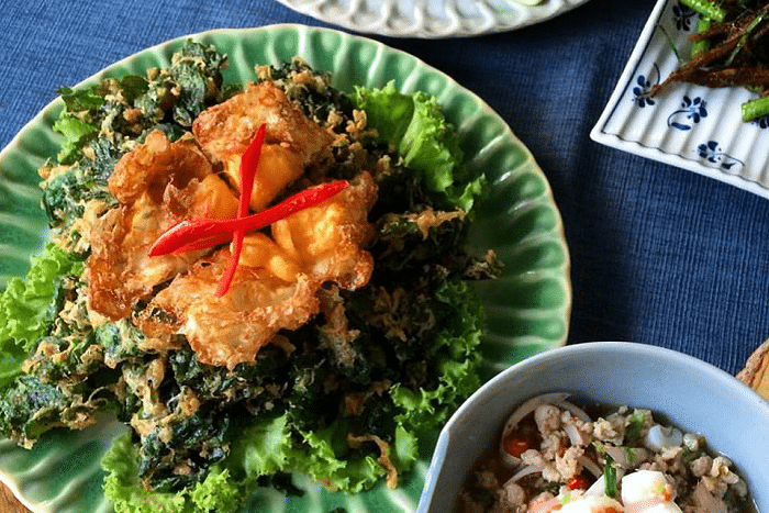 Get the Stir-Fried Glass Noodle with Cowsleep Creeper and Egg (THB150) to fall in love instantly. The complex char on springy glass noodles and crunchy cowslip bulbs is a meal in itself, but the Spicy Crispy Gourd Salad with Fried Egg (THB220) also packs a punch with a delicious pairing of minced meat, shallot, spring onion, dried shrimp and sweet chilli.