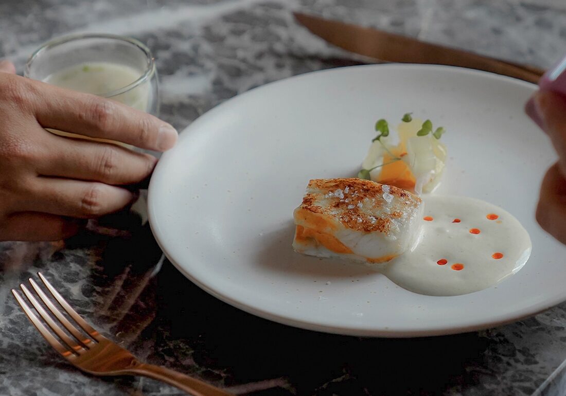 Chef Samuel clearly has a flair for the theatrical – our Hamachi comes topped with Kaluga caviar and served on a plate of bubbling dry ice. Following that, the Pumpkin Laksa Soup has us washing our starters down with laksa rempah-soaked seafood tortellini, puffed rice, and deliciously thick broth.