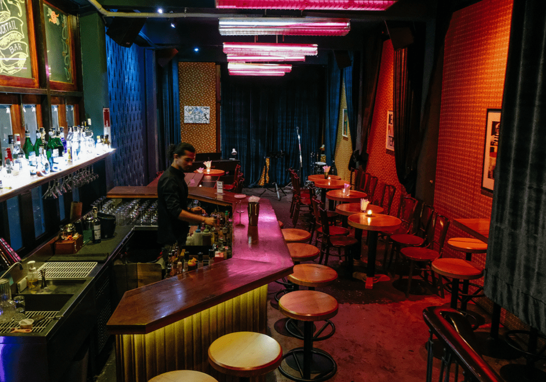 The intimate jazz club on the second floor, Foo de Jazz, is lined with vintage posters and memorabilia framed over the glow of neon pink lights. Hosting live jazz acts every Thursday, Friday and Saturday night from 9pm, the place is abuzz with activity on these nights, and resident drummer and programme director Mr Sticks keeps things lively with his line-up of international musicians. This floor also houses a prohibition era-themed cocktail bar inspired by The Savoy Cocktail Book. French spirits in classic cocktails include the jewel-toned Le Bijou (THB360) and Satan’s Whiskers (THB380), served straight.