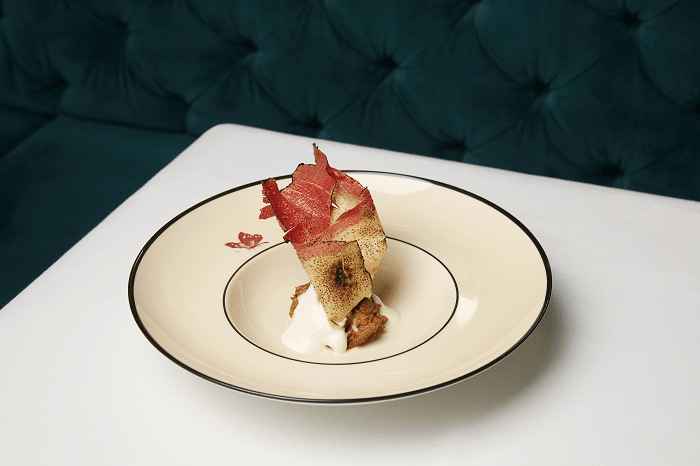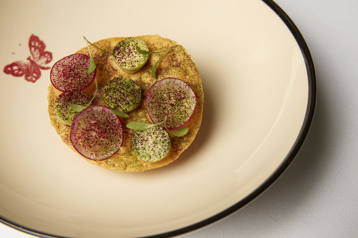 Drawing inspiration from Chef Karime López’s Latin American heritage, the Uni Crab Tostada presented itself as a bed of  sweet crab salad and layered with briny, Hokkaido uni sauce topped with a crisp yellow corn tortilla cracker piled high with pickled radish, avocado pieces, avocado puree and chipotle mayonnaise. Finished with a final dusting of coriander and hibiscus powder, with a touch of coriander cress ends the dish with a mild, tangy finish.