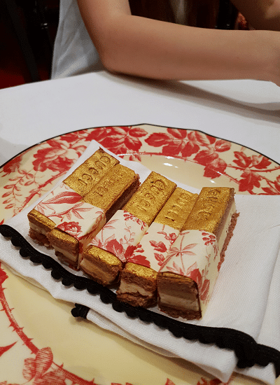 And for dessert: the Charley Marley, affectionately named after chef Bottura’s second son and a fanatic of all things chocolate. Gold-dusted layers of “GUCCI” embossed hazelnut biscuit (in case you forget where you are) encase rich hazelnut pralines and decadent dark chocolate ganache, a stunningly beautiful (and delicious) dessert.